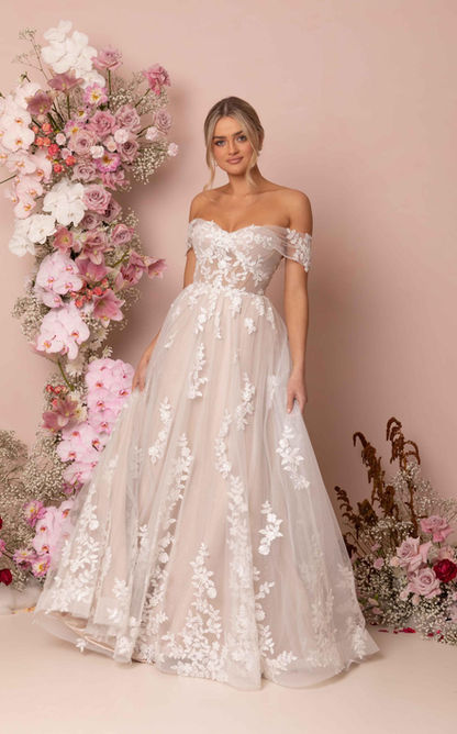 Katiya is wildly feminine and effortlessly romantic with her eyes focused on the end of the aisle and her fairy-tale ending. Delicately crafted from sequin and embroidered lace motif with soft glitter tulle, Katiya sparkles beneath the lights and shines all night long. Highlight your decolletage with a soft sweetheart illusion bodice, thick off-the-shoulder straps and delicately placed lace motifs. This sensational gown has a 3/4 circle skirt gathered at the waist to create a full and flowing skirt and 25” illusion train. The detachable train creates a moment of drama to add to the grandeur of Katiya. Katiya’s harmonious blend of design and function ensures for all day support and comfort, with the 15-piece exposed boning, cup construction, as well as the stretch charmeuse lining.
