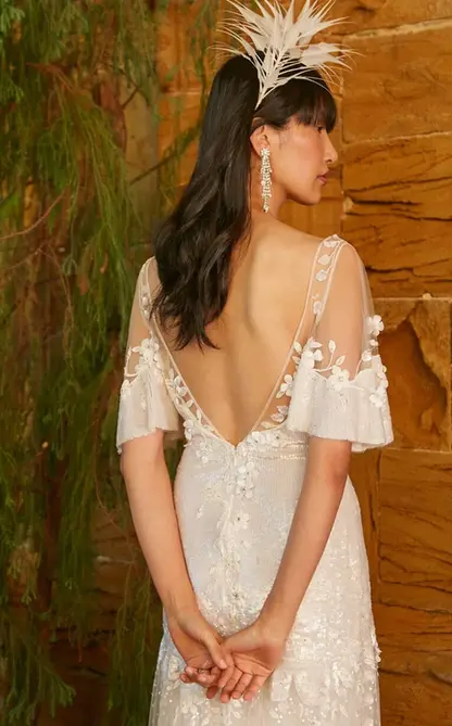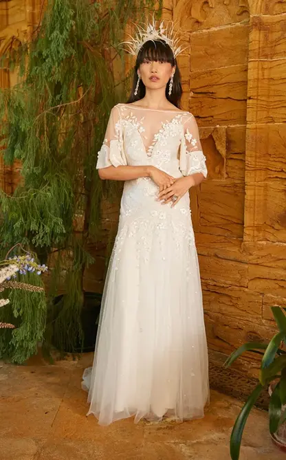 The fully sequinned embroidery of the Ivy Dress gives an elevated glamour to the bohemian charm of this floral artworked gown. The focal point is the enchanting neckline of cascading 3d satin flowers that frames the bodice and disperses out into scattered sequinned leaves across the skirt. The folded satin petals and florals are lined with crystal stones and pearls, and the stems of the flowers are loaded with mother of pearl micro bugle beads, to give the appearance of a corded stitch. The silhouette is based on the iconic Temperley Petal Gown, with a flowing bridal train added. This Italian tulle gown is available in both pearl and platinum.